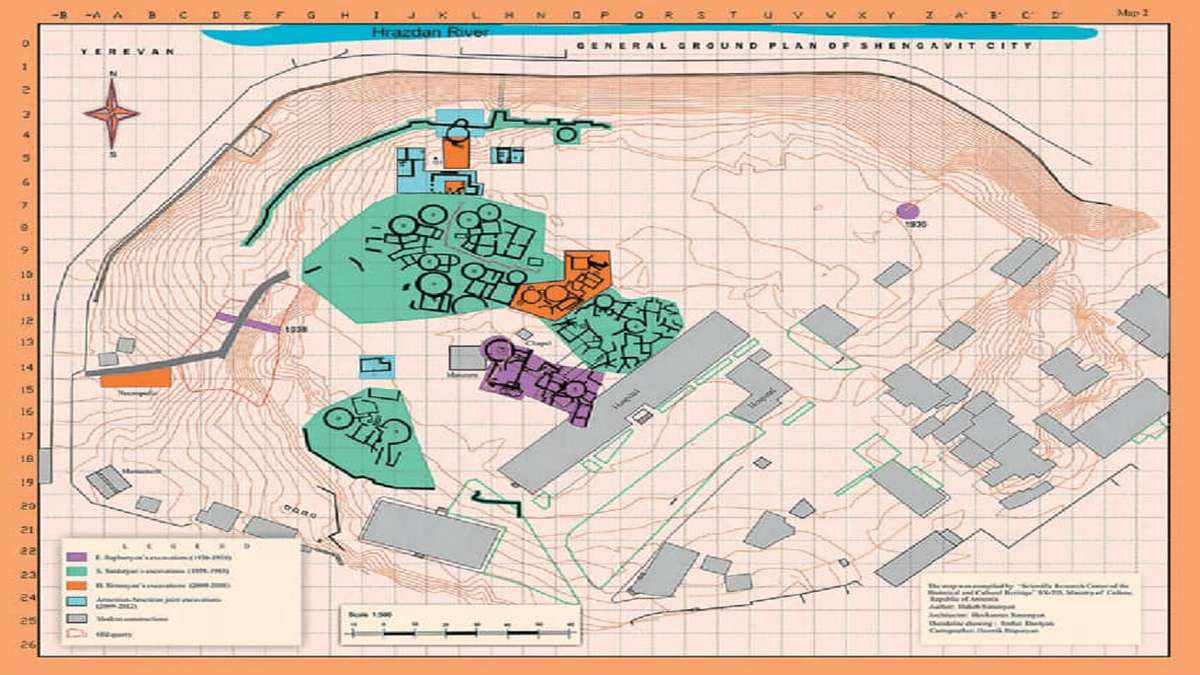 The area of modern day Shengavit has been populated since at least 3200 BC, during the period of Kura–Araxes culture of the Early Bronze Age. Excavations at the Shengavit historical site started in 1936 and lasted until 1938 under the guidance of archaeologist Yevgeny Bayburdyan who dug a trial trench at the hill which in turn led to further archaeological work to be done at the site. Archaeologist Sandro Sardarian resumed the excavations between 1958 and 1983,but his work was poorly documented. He left insufficient records to pinpoint exact locations where artifacts were found.