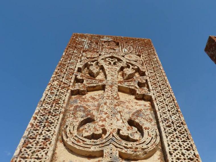 Nearby stand two unique 6-meter-tall khachkars (cross-stones), one dated to 1191 and the other to 1194. Another, smaller khachkar lies right next to the large ones, surrounded by fragments of other khachkars.