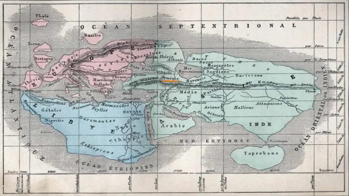 The map was reproduced by A. Villemin in “Earth and Seas, or Physical Description of the World” by L. Figuier, published in Paris by Librairie Hachette in 1884. It reflects Eratosthenes’ understanding of the world at the time, with Armenia located in the eastern part of the Mediterranean region.
