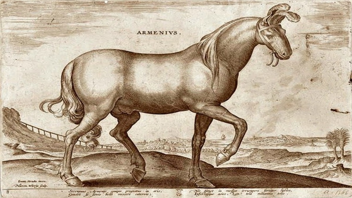 This country is so abundant in horses (rivalling Media) that even the Nisean horses, which served the Persian kings, were raised here. The satrap of Armenia annually sent 20,000 foals to the Persian king for a festival called Mitrakinai. During the invasion of Media with Antony, Artavazd displayed, among other cavalry, an additional 6,000 armored horses, arraying them in battle order.”