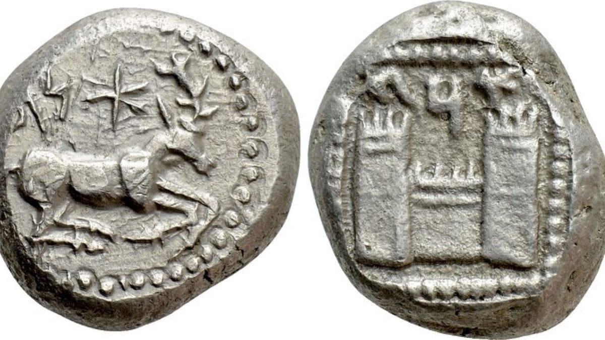 The stag as the symbol of the cult of Artemis is common in ancient coinage and the image of the fortress probably reflected the actual walls protecting the city.