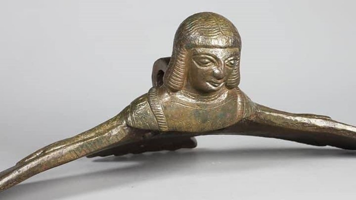 This is a striking bronze sculpture, originating from an ancient Armenian civilization, that portrays a creature with a combination of avian and possibly other animal traits. The headdress and stylized feathers suggest a ceremonial or high-status significance, possibly indicative of a deity, a guardian figure, or a symbolic representation of power. The craftsmanship and attention to detail in the texture and form suggest that it was an important cultural object, possibly used in rituals or as a symbol of authority and protection. Such pieces are remarkable for their ability to convey the artistic sensibilities and mythological concepts of their time, offering a tangible connection to the past.