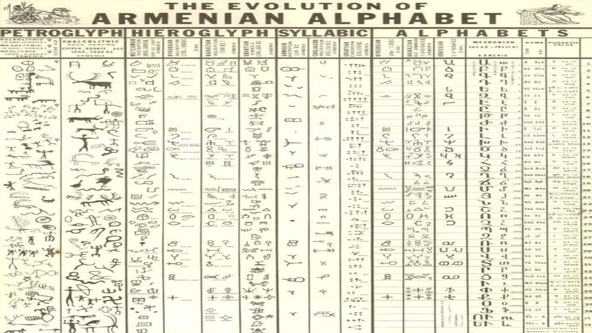 Chart of the evolution of the Armenian alphabet by Melkon Armen Khandjian, from the Stone Age to the present. Armenological studies research and exhibits.
