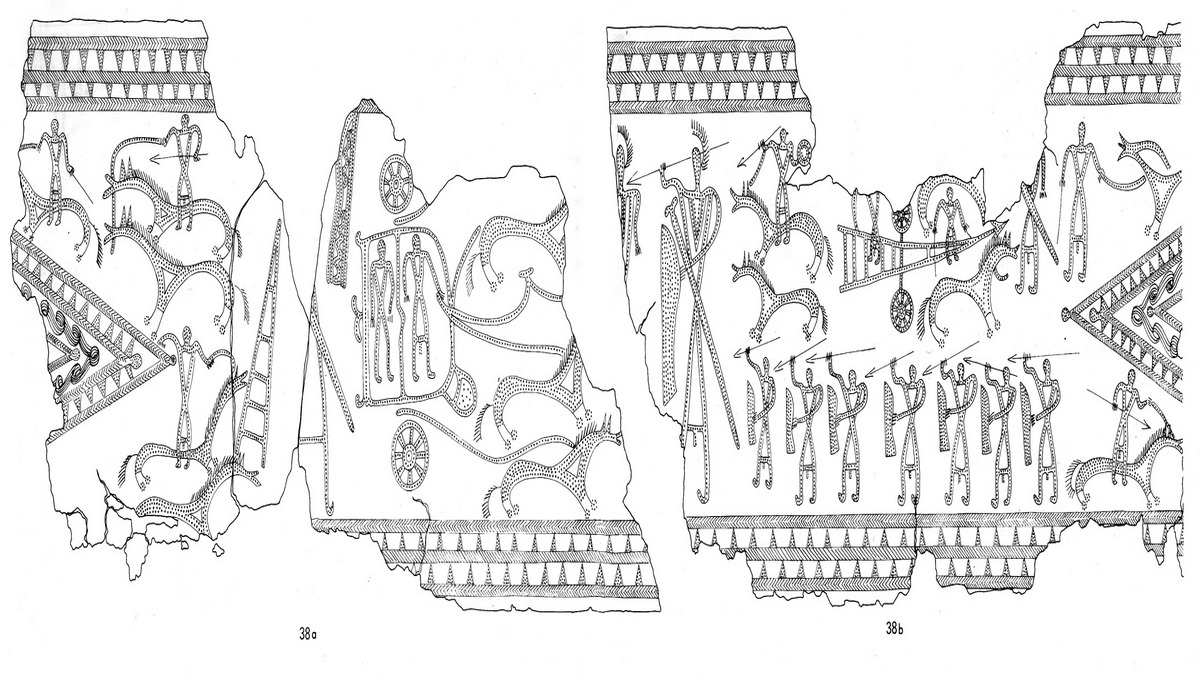 At the centre of the chamber was a two-horse chariot, though only the bronze fittings had been preserved: hundreds of pin-nails to decorate the body. There were also two horse bits, two circular guides for the reins – and a bird statuette. The actual burial was a cremation, a rite which is found in Hittite, ancient Aryan and, in general, in almost all Indo-European upper-class burial rituals. The burial was accompanied by sacrifices of men, animals, among them horses. Imported objects were found coming from the basin of Lake Van (mount Nemrout), 300 miles to the west.