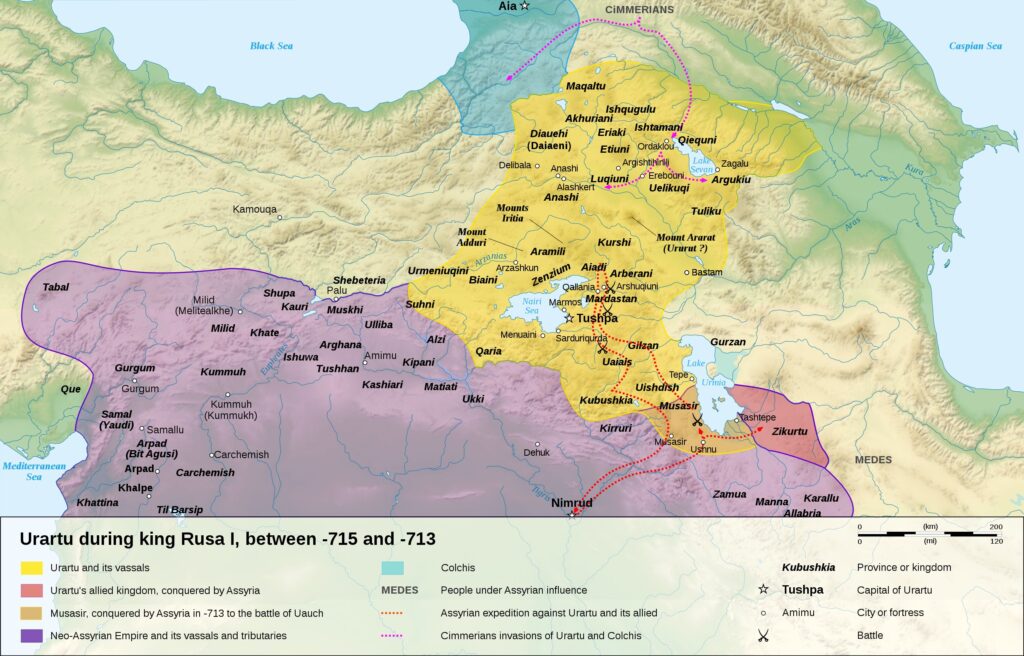 There it says that Urartu was ruled by a king named Sarduri (r. ca. 840–830 B.C.), and mentions a male deity, Haldi, the supreme god throughout Urartian history. Urartu was centered in Armenian Highland, around Lake Van; the capital, Tushpa, was located on the eastern shore of the lake, situated on a high and elongated rock outcrop.