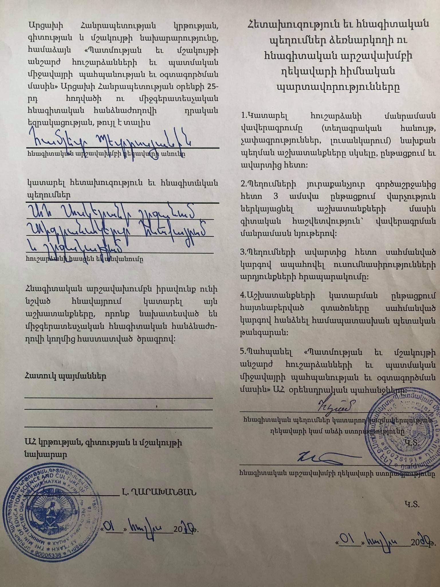 I would like to remind the semi-literate propagandists of the aggressive state that the archaeological excavations in Tigranakert were carried out at the official invitation and with the permission of the Artsakh authorities, that every year the archaeological commission within the Artsakh government issued a special permit, so called an open list, to the leader of the expedition (see photos of some of those permits), that the excavations were financed from the Artsakh state budget.