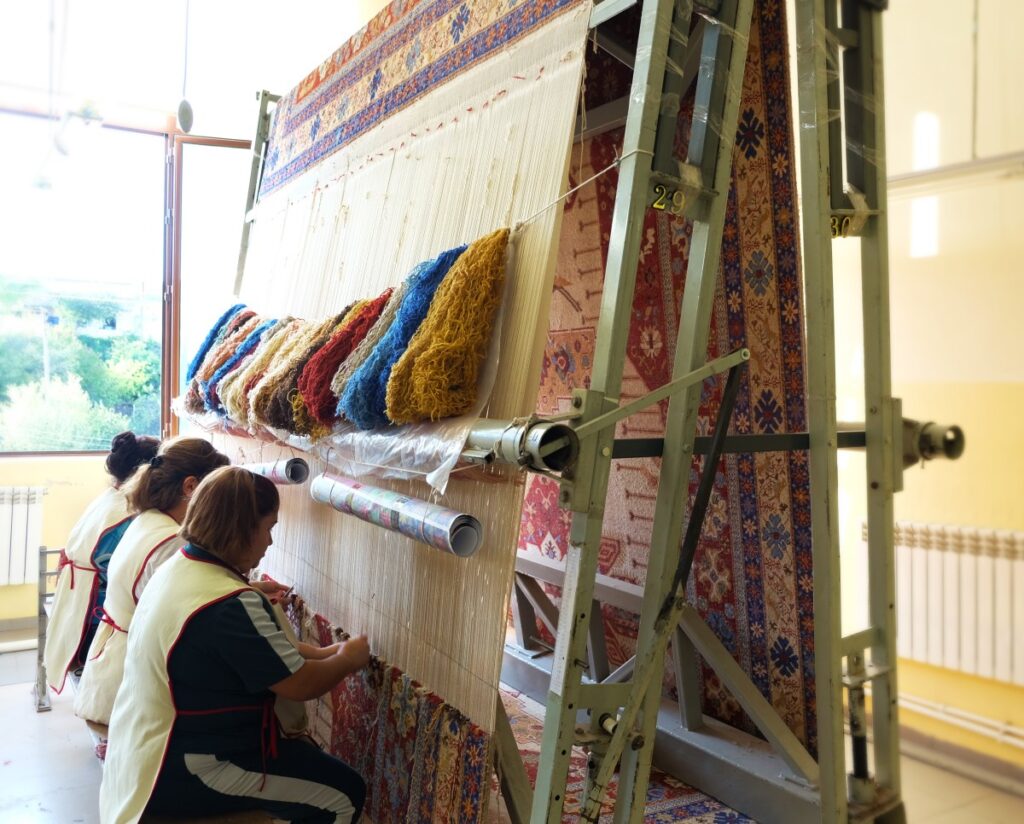 In 2019, I visited the Karabakh Carpet weaving factory in Stepanakert, the capital of the self-proclaimed, but internationally unrecognized, Armenian-led Republic of Artsakh. The firm aims to preserve the art of carpet weaving, producing Armenian rugs with historical and traditional Karabakh patterns of various size, density, ornamentation, and coloration, and all using local sheep’s wool. I observed the exclusively female weavers gently and meticulously play with textile, patterns, and colors. Row upon row of thread and knots on fixed looms were recreating what they consider their ancestral pride — a Karabakh rug.
