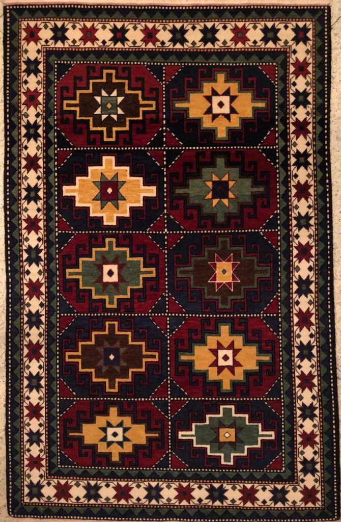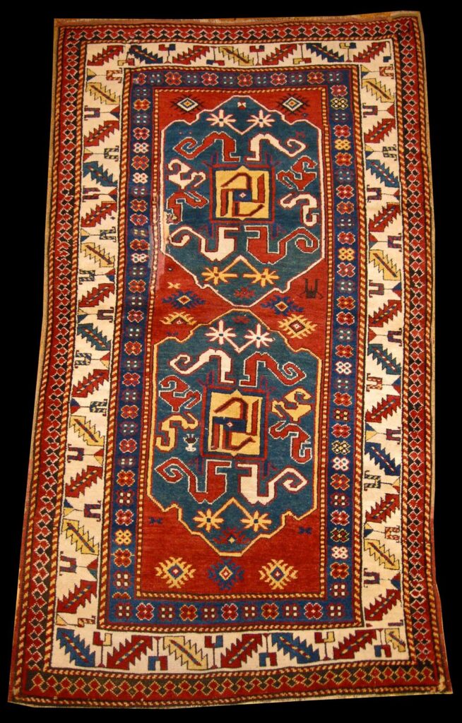 The scholarly world largely considers that the dragon motif came to the Caucasus from China through Mongol invasions. Maktabi agrees with this assessment. This being said, Vahram Tatikyan, author of Ancestral Carpets of Karabagh, argues that the Dragon or “Vishap” was never a ‘foreign’ character to the Armenians. It is found abundantly in ancient Armenian mythology and oral folklore — often understood as large serpents. For example, the Armenian god of fire, thunder and war, Vahakn, was known as Vishapakagh – meaning the dragon reaper.
