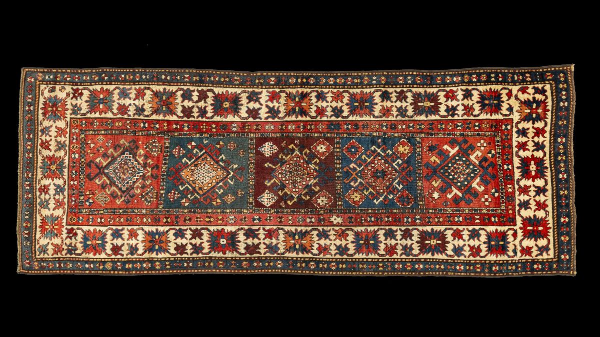 A beautiful array of colors. These compartmentalized rugs were Armenian designs. Its main border with large Crosses is absurdly called a “Crab border” in the trade to deny Armenian provenance.