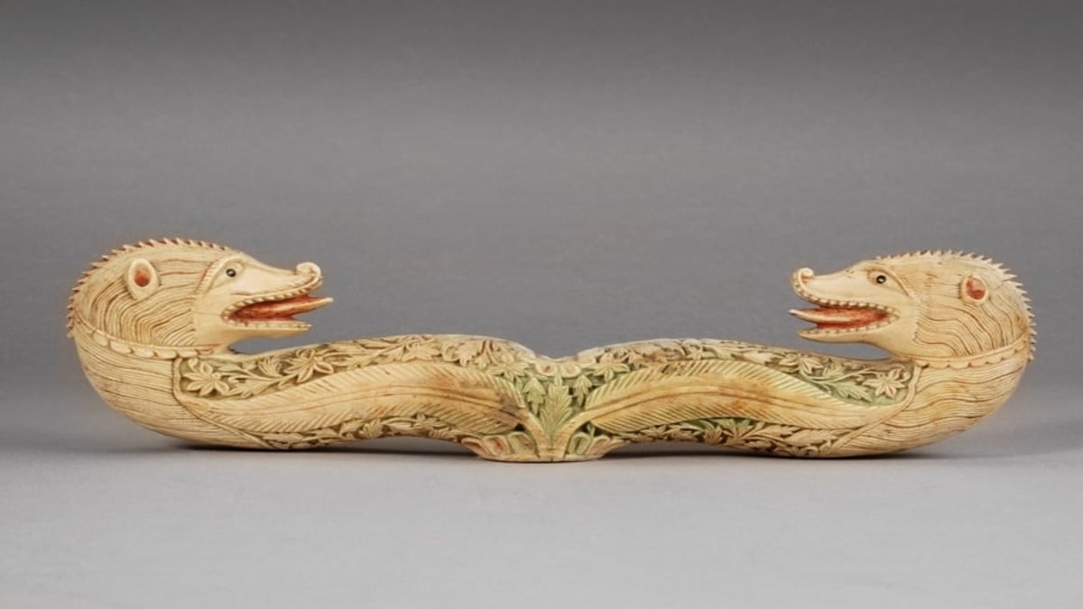 Armenian Church Staff (17th Century): Ivory tau belongs to an unknown Armenian artist from the 17th century. A two-headed dragon with ruby eyes in gold patterns. Floral scrolls are engraved on the shaft, and protruding parts of the hands were inlaid partly with gold, partly with a black compound.