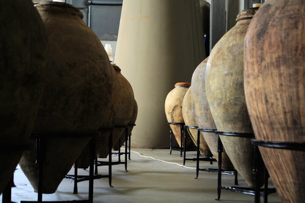 From the Zorah winery you can see a gaping cave in the cliffside. Here archaeologist Boris Gasparyan has found evidence of winemaking from about 4,000 BC. He showed me around the partially excavated site, it is not open to the public, and pointed out the jars that looked uncannily like Zorik’s amphora. He then pointed to other jars which contained traces of bones and blood probably from human sacrifice. Or a party that got out of hand. Evidence of Armenia’s ancient wine culture is everywhere. There are grape motifs on monasteries, churches and even on Soviet era buildings. I saw wild vines, vitis sylvestris, growing by a river and dotted around the country, by the side of the road, in restaurants and family houses, are amphora like the ones at Zorah winery.