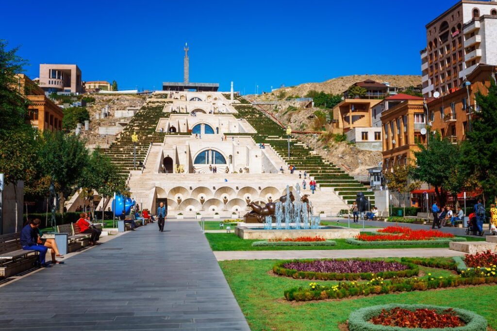 It is 572 limestone steps from the modernist sculpture garden at the base of Yerevan’s stark white Cascade to its top. The two staircases, interspersed with layers of greenery, fountains and waterfalls, link the city’s downtown with its upper Monument neighborhood, which offers stunning views of the city and Mt. Ararat.