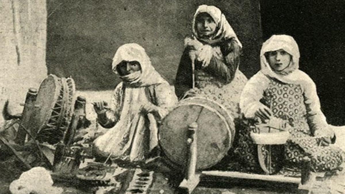The image depicts Armenian peasant women from the late 19th century engaged in the art of carpet weaving. As seen, the women are dressed in traditional Armenian attire, signifying the rich heritage and cultural authenticity of the time. They seem to be in the midst of weaving, surrounded by tools and looms.