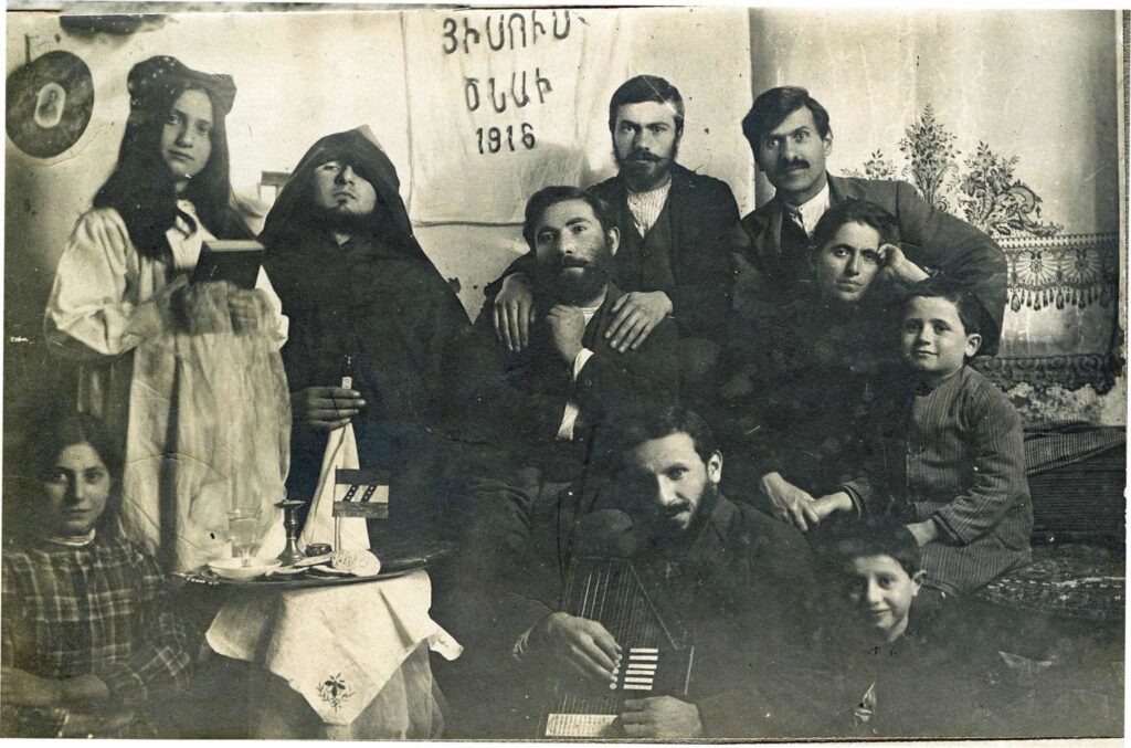 In January 1916, the Dildilian and Der Haroutiounian families prepared to secretly celebrate Armenian Christmas at the latter’s house, on the outskirts of Marsovan (modern day Merzifon, Turkey). This was their first Christmas since they had evaded deportation by converting to Islam. The occasion was immortalized in a rare photograph that is part of the collection of the Dildilians, famed photographers of everyday life in the Ottoman Empire. In his book, Reimagining a Lost Armenian Home, scholar Armen T. Marsoobian identifies and reconstructs the trajectories of the family members depicted in the photograph.1