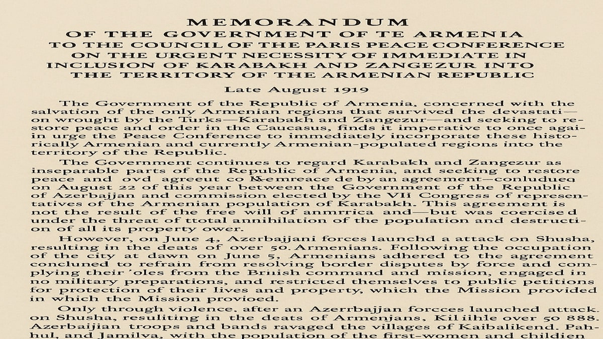 The Government of the Republic of Armenia, concerned with the salvation of the only Armenian regions that survived the devastation wrought by the Turks—Karabakh and Zangezur—and seeking to restore peace and order in the Caucasus, finds it imperative to once again urge the Peace Conference to immediately incorporate these historically Armenian and currently Armenian-populated regions into the territory of the Republic.