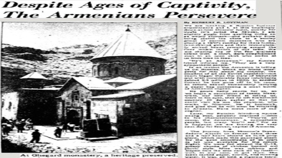 The Armenians are entitled to pursue their daytoday interests, to breed, even to prosper. On the surface, Armenian culturemusic, dance, the plastic arts—thrives. But the Armenians are a captive people; they are expected to think and talk and vote by Moscow time. The only independent Armenian state in modern history was snuffed out by Lenin in 1920.