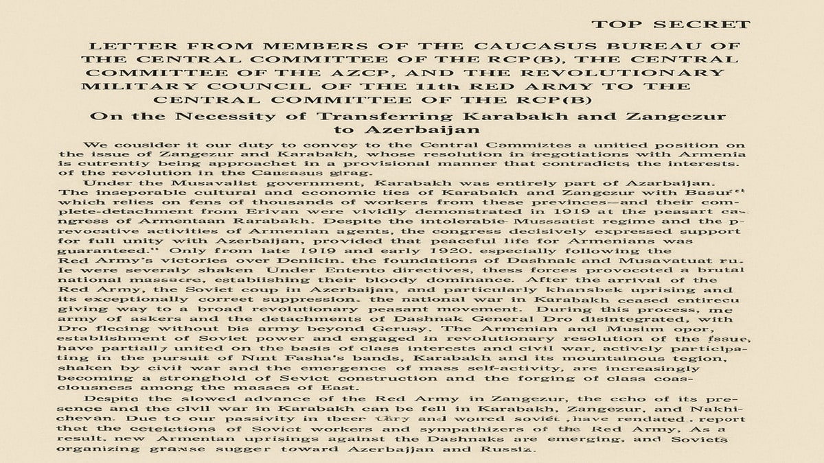 We consider it our duty to convey to the Central Committee a unified position on the issue of Zangezur and Karabakh, whose resolution in negotiations with Armenia is currently being approached in a provisional manner that contradicts the interests of the revolution in the Caucasus.