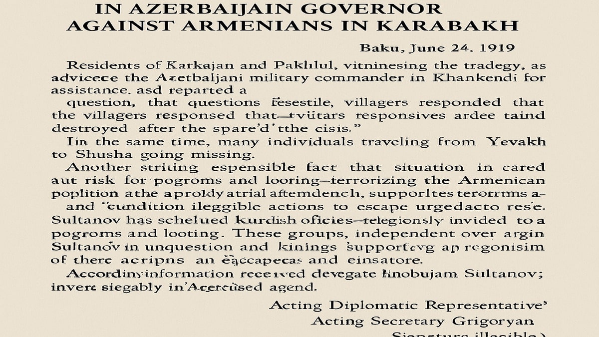 “Yesterday, members of the Azerbaijani Parliament, Chubaryan and Khodzhayan, returned from Karabakh, accompanied by two Tatar parliamentarians, Karabekov and Rustambekov. That evening, during a report presented to the National Council, it became clear that Governor-General Sultanov is undoubtedly responsible for the bloody events that occurred in Karabakh on the 4th and 5th of this month. These events were premeditated by Sultanov the day prior, through the seizure of roads leading from the districts to Shusha and the strategic positions overlooking the city.