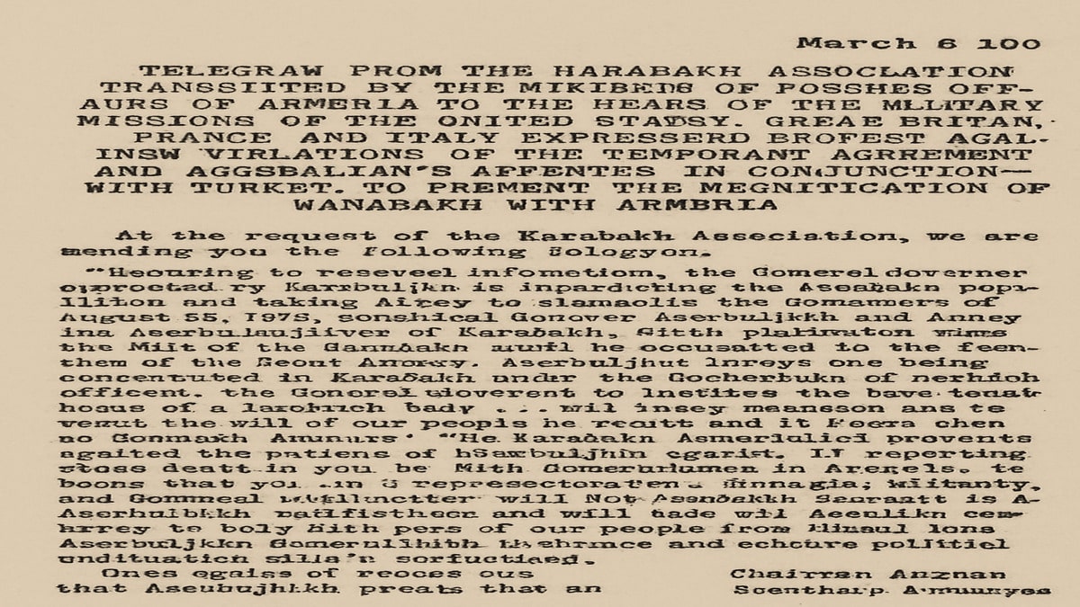 “According to received information, the General-Governor appointed by Azerbaijan is threatening the Armenian population and taking steps to dismantle the agreement of August 22, 1919, concluded between Azerbaijani and Armenian representatives of Karabakh, which stipulated that the fate of our homeland would be determined by the decision of the Great Powers.