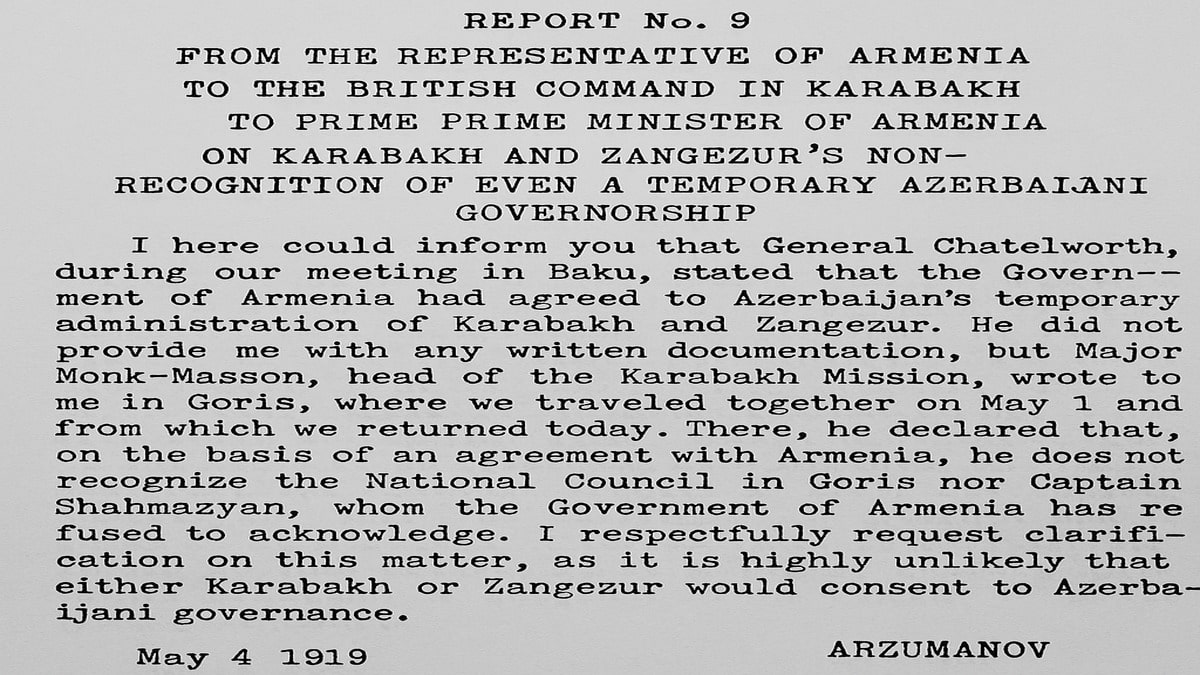 I hereby inform you that General Chatelworth, during our meeting in Baku, stated that the Government of Armenia had agreed to Azerbaijan’s temporary administration of Karabakh and Zangezur. He did not provide me with any written documentation, but Major Monk-Masson, head of the Karabakh Mission, wrote to me in Goris, where we traveled together on May 1 and from which we returned today.