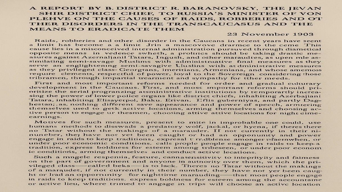 REPORT By the Acting Uezd Chief of the Dzhevanshir Uezd, D. Baranovsky, To the Minister of Internal Affairs of Russia, von Plehve On the Causes of Robbery, Banditry, and Other Disorders in the Caucasus and Measures for Their Eradication November 23, 1903