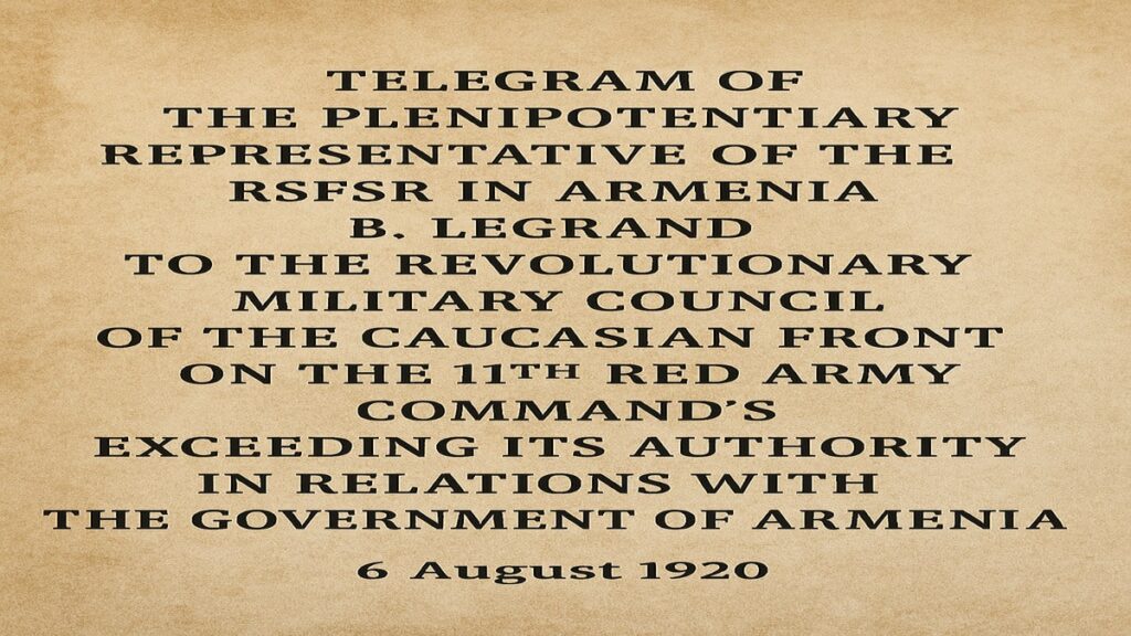 From the latest summaries and reports of the Revolutionary Military Council of the 11th Army, as well as from documents handed to us by the Government of Armenia, it appears that the command of the 11th Army has, firstly, failed to secure a firm occupation by our forces of the city of Nakhichevan and the Shusha–Geryusy–Engelaurt–Karmelinovka–Nakhichevan route; secondly, having not carried out the direct order given to it, has issued ultimatum demands directly to the Armenian command that are not coordinated with our overall political line, and has accompanied those demands with threats whose execution lies beyond its competence and actual capability. In the reports addressed to us by the command of the 11th Army there is even talk of a firm intention to go over to the offensive and to eliminate the “Ararat Republic.”