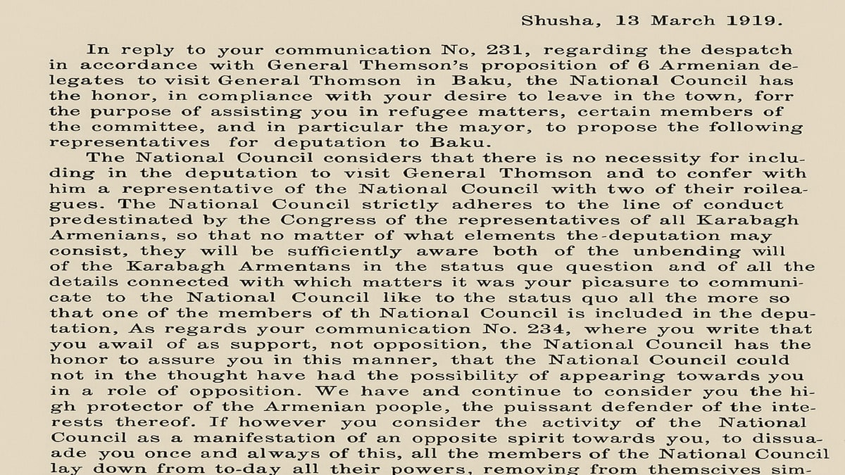 Given these events, the Council delegated Bishop Vahan of the Karabakh Diocese and Council member G. Bagaturov to Baku to present General Thomson with a memorandum outlining the situation and demands of the Armenian population. These demands are: