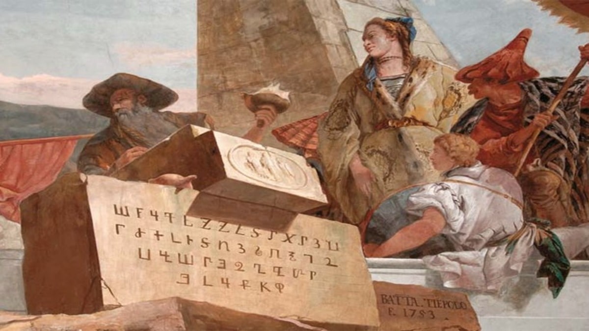 The fresco depicts Mesrop Mashtots, carrying a stele from Bishop Daniel across the sea with clearly depicted Armenian letters. Just a few years after Mashtots’ journey, in the 30s of the 5th century, his disciple Movses Khorenatsi and his comrades sailed the seas to Palestine, Egypt, Italy, and Greece with the aim of spreading restored literacy among the local Armenian population.