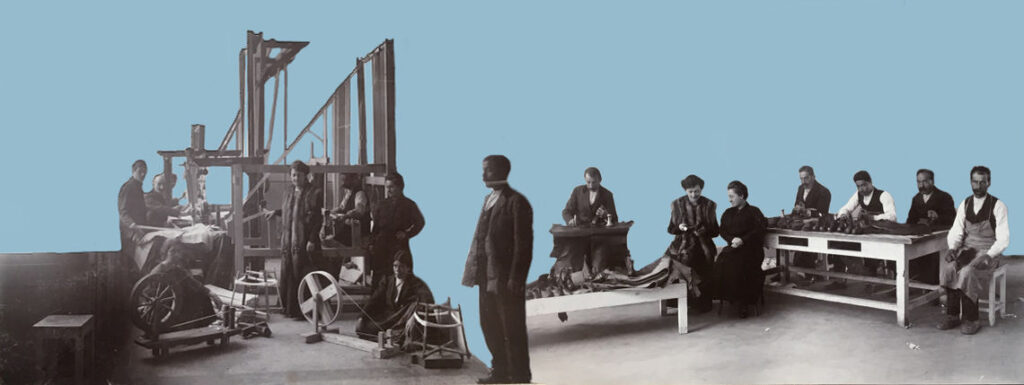 Countess Toumanyan at the carpet weaving and shoemaking workshops she had set up for the survivors of the Hamidian massacres.