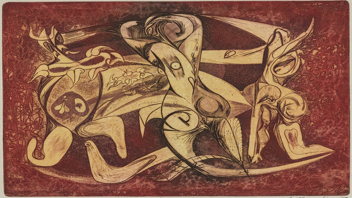 Perhaps Barooshian’s greatest contribution to printmaking was with a method known as color viscosity printing, which dominated his output starting about 1956. During his stay at Atelier 17 in Paris, Barooshian evolved the technique, pushing its limits in order to reach his artistic vision of imagined realities and dreamscapes.
