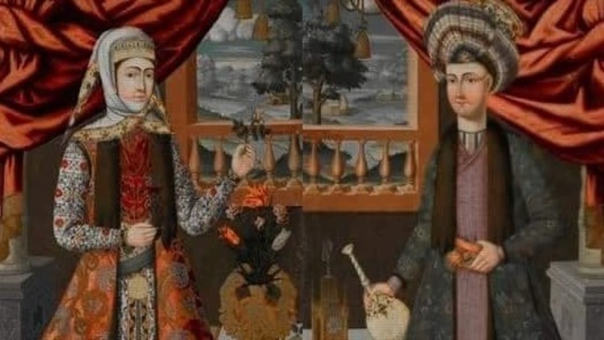 The first portrait depicts a woman dressed in elaborate clothing adorned with intricate patterns and jewels. Her poised stance, coupled with her regal attire, suggests a person of importance or noble lineage. The detailed backdrop, showcasing a scenic view, further accentuates her elevated status.